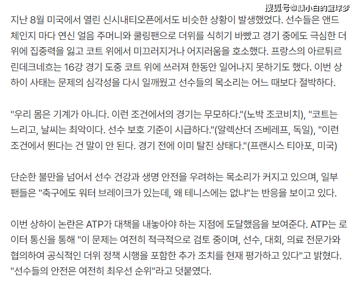 韩媒狂批ATP:暴热天气就该停赛 制度落后WTA至少五年 心疼德约辛纳